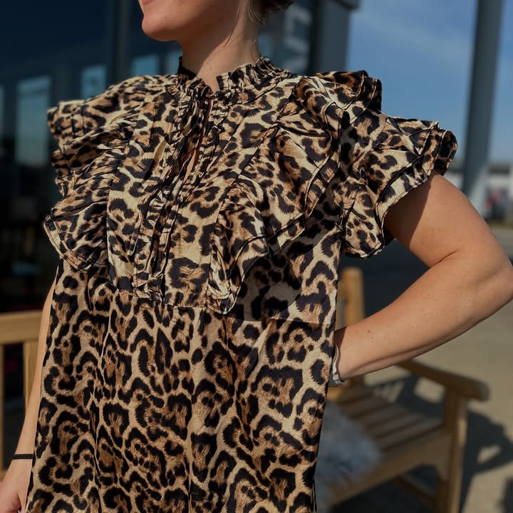 Den fine leopard kjole fra Stories From The Atelier har fine flæsedetaljer ved skuldrene og halsudskæringen. Det lette materiale og den løse pasform gør kjolen perfekt til både hverdagsbrug og festlige anledninger